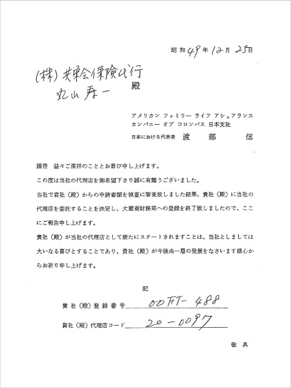 共栄会保険代行設立 アメリカンファミリー生命(現アフラック)と代理店契約を締結
